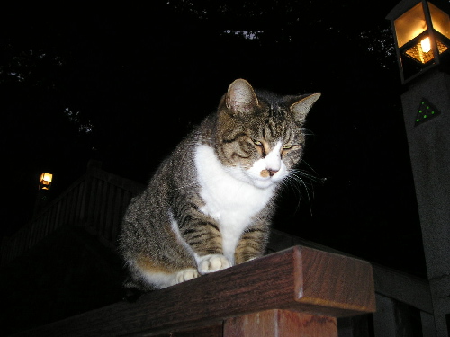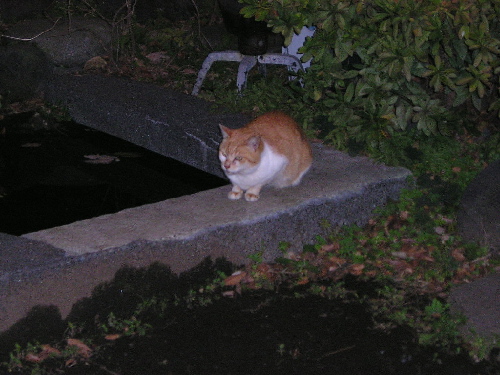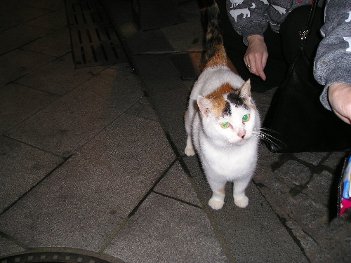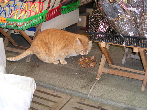 ここからは猫たちの映像です。お楽しみあれ まずは食事中の猫。店先で堂々と食べております。お客がそれを避けてお買い物