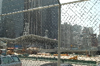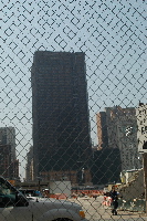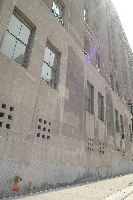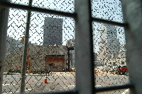 | 柵越しに | 隣接ビルの壁面。 あの事件の際に傷ついているのを修復した跡 |