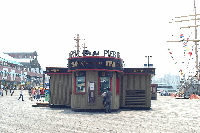 | 券売所。ここは、観光の拠点ですからいっぱい いろいろな種類の券が売られていますよ。 | 入り口のベンチ。 座ったら痛そう・・ |